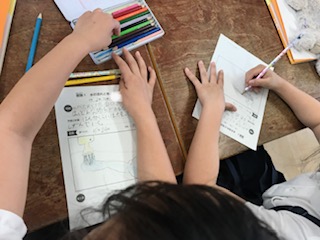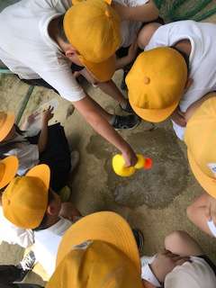 運動場にじょうろでみずを流して、その流れ方を観察しています。流れ方には、何か特徴があることをつかんでいました。教室ではノートに結果をまとめていました。