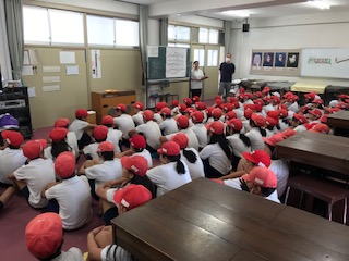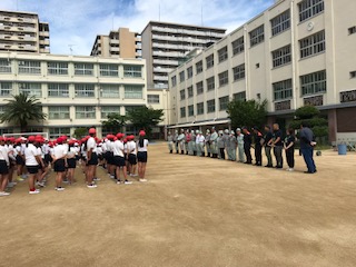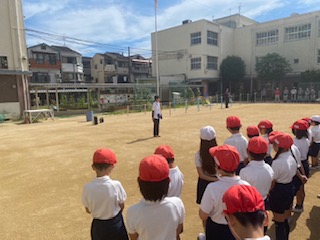 蒸し暑い日になりましたが、PTAと地域、区役所・消防署の方々にご協力いただき、合同で避難訓練と災害学習を行いました。避難訓練では、約束を守り、安全に落ち着いてすばやく運動場に集合できました。