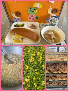 ガーリック、しょうゆ、オリーブ油で下味をつけて、焼き物機で焼いています。お肉も柔らかくガーリックの風味もありパンによく合う献立になっています。