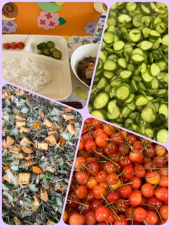 「牛肉と野菜のいため煮」は、牛肉を主に、糸こんにゃく、あつあげ、玉ねぎ、にんじん、えのきたけ、青みにさんどまめを使用し、砂糖、みりん、塩、しょうゆで甘辛く味付けしています。ごはんが進む献立です。「さくらんぼ」は、年に1回、生のさくらんぼが、登場します。みんな給食を取りに来た時、とても喜んでいました。