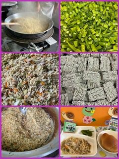 「和風焼きそば」は、今日はしょうゆ味の焼きそばであっさりした味付けになっています。「オクラの甘酢あえ」は、少し甘めのタレでとても美味しかったです。焼きそばとの組み合わせもよかったでした。