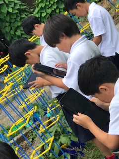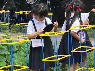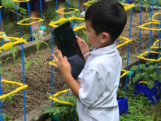 あさがおの様子をタブレットに撮影して記録しています。タブレットを使う時の顔も、成長して学びに真剣な表情になっています。どんな写真が撮れたかな。