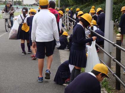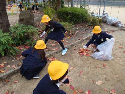 1時間目にクリーンアップ清掃に行きました。中央公園ではたくさんの落ち葉や小さなゴミが落ちていました。子どもたちはきれいにするために一生けんめいにゴミを拾っていました。ごみ袋4つ分たくさん拾いました。