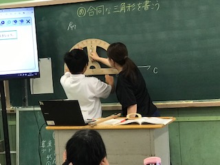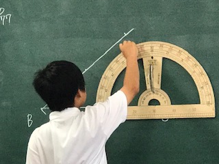 同じ二つの三角形をかく、つまり、合同な図形の作図です。コンパスを使う方法と、分度器を使う方法、どんな特徴があるか、どう違うか、などもしっかり理解を深めていました。黒板にかくこと、前での説明にも、高学年らしくなれてきたようです。