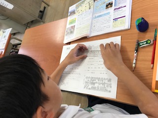 縮尺の意味と考え方を学んでいました。地図上の長さから、実際の平城京の広さや通りの距離を算出できます。算数の学習したことや数学的思考が、社会科でもいかされます。
