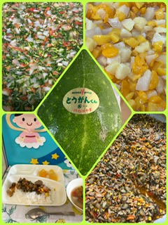 この献立は、令和5年度学校給食献立コンクール優秀賞に選ばれた献立です。給食で夏野菜をたくさん食べて体力をつけることができるように工夫された献立です。彩りのよい野菜がたくさん入り、ごま油の香りもして食欲が進む献立になっています。