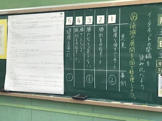国語の教材文には、現代らしく、インターネット上での意見文を比べて、文章の特徴や意見の内容を読み取る学習内容があります。短い表現の中に、どんな考えや具体例が挙げられているかを表にまとめ、各意見の関係性を図示する学習です。
