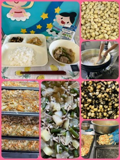 「ささみと野菜のごまみそ焼き」は、給食献立検討会議で開発された新献立です。ささみ、キャベツ、にんじん、ねりごま、砂糖、しょうゆ、白みそで作った調味液を混ぜあわせて焼き物機で焼いています。彩りのよい一品でした。「ひじき豆」は、でんぷんをまぶして油で揚げた大豆に、ひじきが入った甘辛い調味液をからませています。食物繊維や鉄分が多く含まれる献立になっています。「ごちそうさまでした。ありがとうございました」とみんな元気よく挨拶していました。