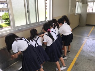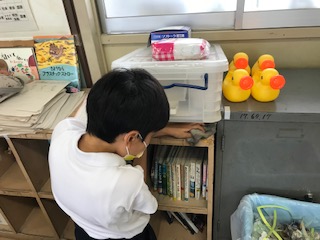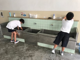 手洗い場やケースの下も、時間をかけてふき掃除です。掃除が終わったら、手もしっかり洗っています。