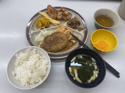 ごはん、みそ汁、和風ハンバーグ、鶏肉の唐揚げなどです。おいしくいただきました!
