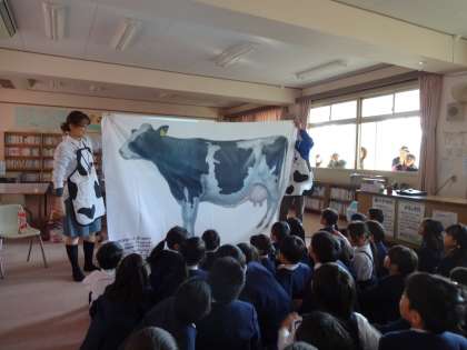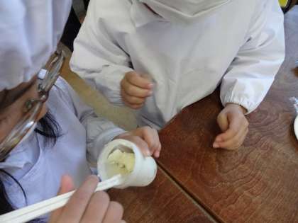 土曜授業で雪印メグミルクの方に来ていただき牛乳についての出前授業をしていだだきました。2時間目に牛乳の栄養について勉強し、3時間目には生クリームからバターをつくりました。とても上手にバターを作ることができ、できたバターはクラッカーに乗せて食べました。できたてのバターを食べ、子どもたちから「おいしい!」の声が上がりました。