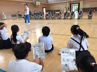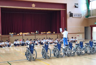 毎年、3年の学習で、バリアフリーやユニバーサルデザインに関することを学び、誰にでも優しく住みやすい町を考えます。今回も大阪市立リハビリセンターの方々をお招きして、講義と車椅子体験授業をしていただきました。