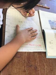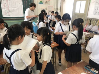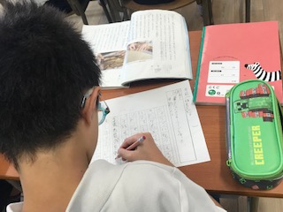 キーワードとなる語句を見つけて、自分の要約文を一生懸命作っていました。しして、互いに作った要約を読みあい学び合っていました。