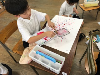 網とブラシを使った「スパッタリング」、絵の具をストローで流す「吹き流し」、スポンジを使った画法など、いろいろな道具を使ってイメージ通りに表現する学習です。