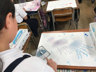 宇宙や海中の様子、生き物をイメージに合った画法を組み合わせ楽しみながら表現していました。出来あがりが楽しみですね。