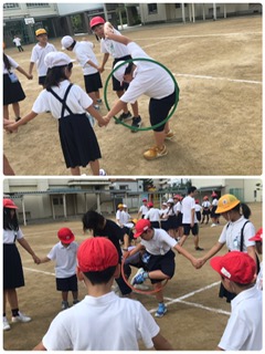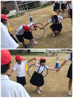 木曜の児童集会、2学期はじめのたてわり班活動で、フラフープくぐりのゲームをしました。手をつないでフラフープをくぐります。運営委員会の児童の説明の後、音楽に合わせて楽しく仲良くチャレンジしていました。