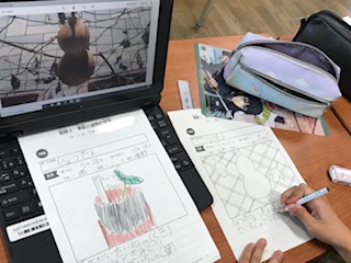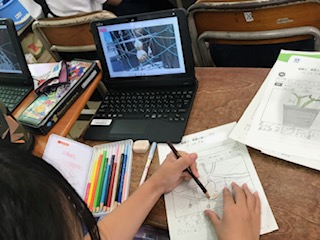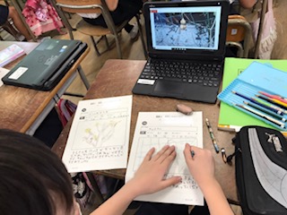 気温が高く、屋外での観察学習は、熱中症の危険があります。タブレットを活用すると、教室で落ち着いて、記録をかくことができます。効果的なタブレット活用をいつも先生達は工夫しています。