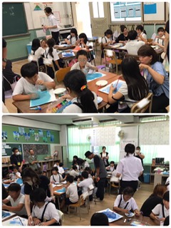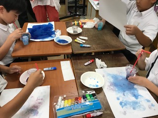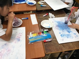 色水シャボン玉を使って海を表現します!保護者の方と一緒に活動する姿も見られ、普段とは違う授業と作品