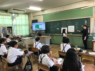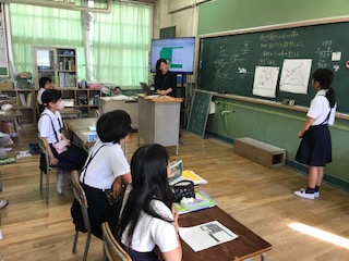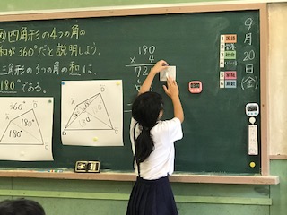 多角形の内角の和についての学習でした。子ども自身が前に出て、具体物を使って考え方を発表し学び合っています。学び合い高め合う学習に大切な力です。