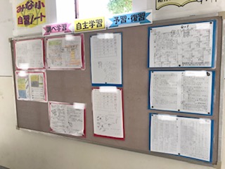玄関はいってすぐ、1階の掲示板には、みな小自学ノートの取り組みが、各学年から寄せられています。