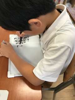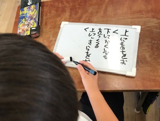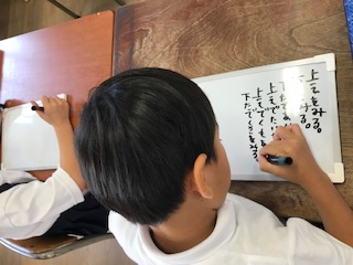 今日学習した、上と下という字で文章を作り、ホワイトボードに書いています。一人1枚のホワイトボードの使い方にもなれてきました。一斉に見せ合ったり、黒板に貼ったりすると、一瞬でたくさんの友達の考えやアイデアが分かります。