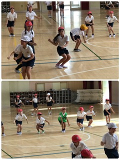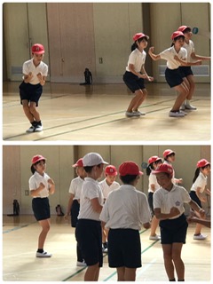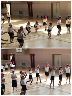 運動会に向けて、表現運動(ダンス)の練習が各学年で始まっています。まずは、振り付けを覚える段階ですが、先生のふりを見て、同じように動いて覚えています。