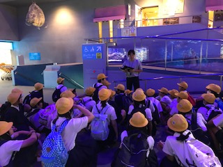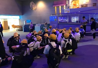 入場しました。班に分かれて、注意事項を確認しています。この後は、班別で見学です。15時30分からのアシカショーはみんなで見る予定です。