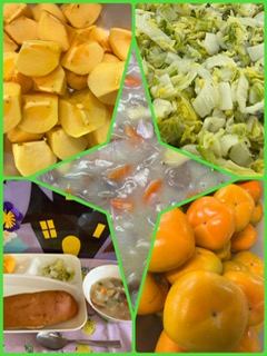 「鶏肉とさつまいものシチュー」は、鶏肉の旨みとさつまいもは、あっさりとした甘みで、パンによく合う一品です。「はくさいのピクルス」は、熱いうちにタレにつけているので、味がしっかりついています。