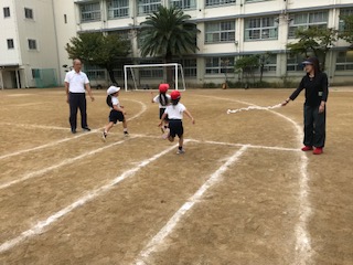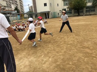 徒競走をはやく走り切るコツは、ゴールテープより向こうをめざして走り切ることです。
