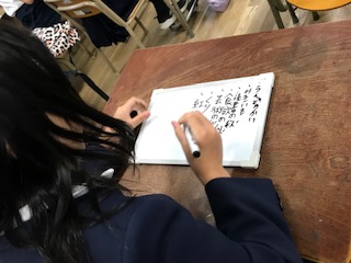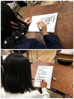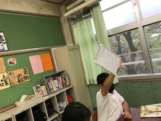 「しんにょう」のつく漢字や秋の食べ物など、言葉に関するクイズが続いていました。いくつ書けたか、友達と見合ったり、掲げたりして、簡単に使えてすぐに確認できることもホワイトボードの良さです。楽しみながら学び合いになっています。