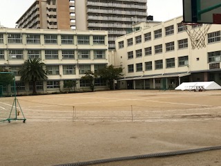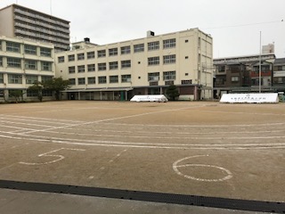 ラインが美しく引かれた運動場、雨に打たれて、なんだか寂し感じます。