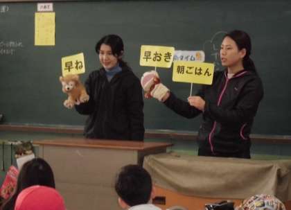 そこで、朝ごはんを食べるきっかけになってほしいと、給食主任と養護教諭が3年生に「朝ごはんをパワー」のお話をしました。