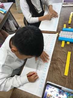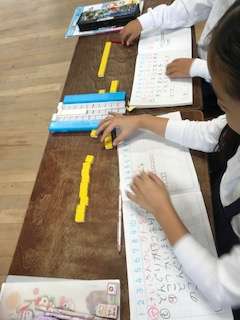ブロックの操作を通して、具体的な物から学習し理解を進めています。ノートの書き方もとても成長しています。