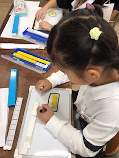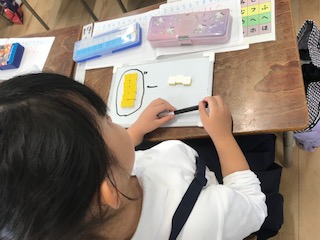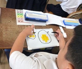 ホワイトボードを活用して、10のまとまりをわかりやすく表現しています。マグネット式なので、机からの落下も防げて、作業しやすいようです。ペンで書き込むことにも慣れてきたようです。思考を深めたり、表現を広めたりなど、学力の伸びにつながると考えています。