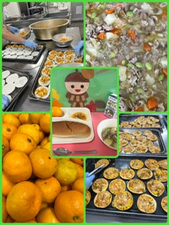 「変わりピザ」は、ぎょうざの皮にツナ、コーン、ピーマン、チーズ、ピザソースを混ぜ合わせてのせ焼き物機で焼いています。大好評な献立です。お野菜たっぷりなスープ煮と、甘みいっぱいのみかんがついています。
