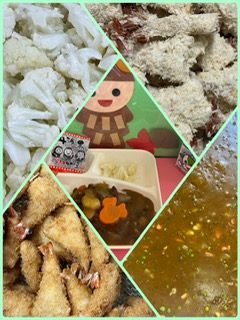 「エビフライカレーライス」は、ラッキーにんじんが入った子どもたちにもとっても人気のカレーに、よく揚がったエビフライが1人1尾添えています。