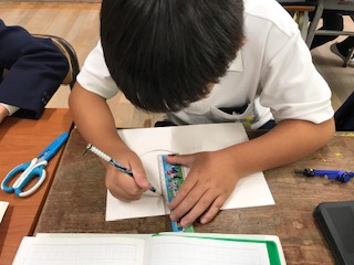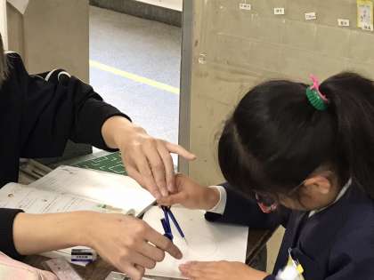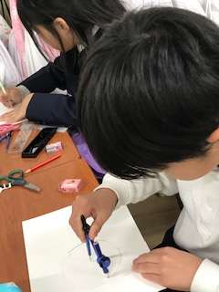 コンパスではじめて円をかく学習です。コツを掴むまで難しいコンパスですが、はじめてにしては、みんなとても上手にコンパスを扱ってきれいな円をかけています。中心や半径も書き加えて学んでいました。