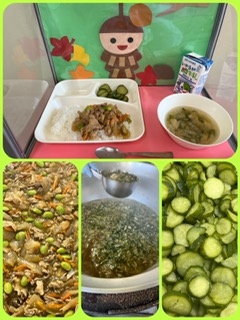 「ピリ辛丼」は、豚肉を主材に彩りの良い枝豆を使用し、赤みそやトウバンジャンでしっかりとした味付けをしているので、ごはんがとても進む献立になっています。