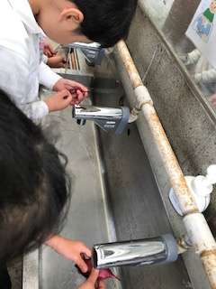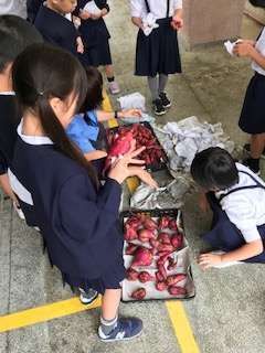 明日、おいしく調理され、子どもたちの笑顔を見ることを楽しみにしているサツマイモさんたちです。