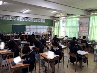 国語の学力調査中です。この学力調査に向けて、日々の目標をたてて気持ちを高めてきました。熱心に問題に向かっている様子や字のていねいさから、頑張ろうという気持ちや意思が伝わってきました。あきらめず努力することが大切、さすがに6年生です。