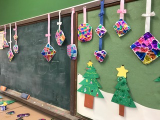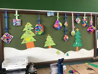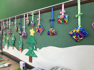 昨日のページでご紹介した作品が完成しています。クリスマスツリーや飾りが出来上がりました。今は教室をクリスマスを待ちきれないかのように飾って、わくわく感を出しています。