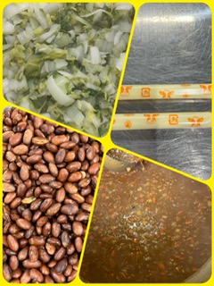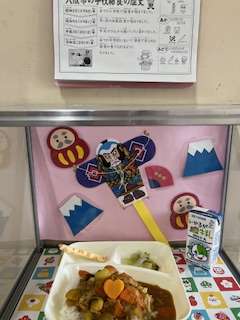 「豚肉と金時豆のカレーライス」は、豚肉を主に玉ねぎ、じゃがいも、ドライパックの金時豆が入っているカレーライスです。ハートの形のラッキーにんじんが入っています。「はくさいのピクルス」は、湯がいたはくさいに、ワインビネガーの程よい酸味と砂糖の甘みのある調味液でつけています。カレーライスとの組み合わせが良かったです。