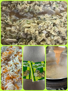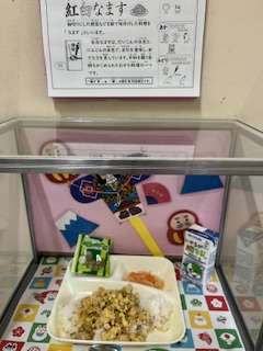 「親子丼」は、この献立は(卵除去食)の献立です。鶏肉、玉ねぎ、青ねぎを甘辛いだしで煮て、卵を加えてごはんを盛り付けた上にかけます。