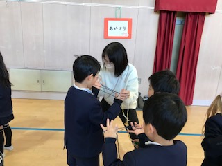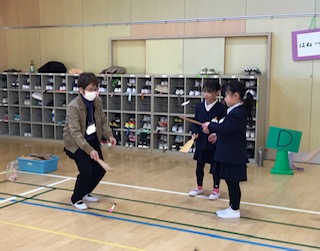 おはじきで細かく指先を動かす隣では、羽根つきで体全体を動かす姿が見られました。