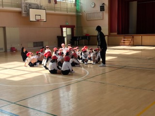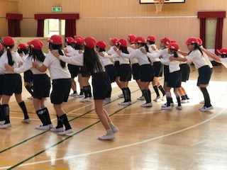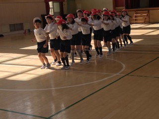 今日は、懐かしい「ジェンカ」の曲を使って、リズム運動をしていました。同じ動作の繰り返しですが、チーム合わせてリズミカルに、互いの距離を考えて動くことがコツ。何度か繰り返し練習する中で、ラインが脱線しないようにダンスも楽しめるようになりました。
