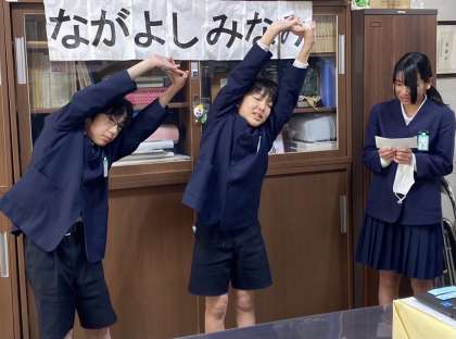 駆け足運動にも対応、長吉南体操がバージョンアップ!みんなでストレッチタイムです。