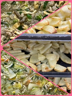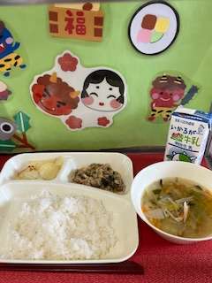 「豚肉とずいきのみそ煮」は、干しずいきはさといもの葉柄のことで、カルシウムや鉄、食物繊維が多く含まれています。昔から食べられている乾物の一つです。食べやすいように、赤味噌を使用して甘みのある味付けになっています。