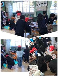 長吉第1保育所と第2幼稚園の年長組のみなさんと1年のみなさんが、交流会を行いました。グループに分かれて、1年生が遊びを教えて一緒に楽しく過ごしました。お互いにはじめは緊張気味でしたが、活動を通して笑顔や会話が見られ和やかでにぎやかな教室になりました。小学校では、一番年下でかわいらしい1年生も、ここではしっかりとした頼もしいお兄さん・お姉さんでした。