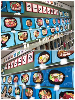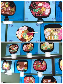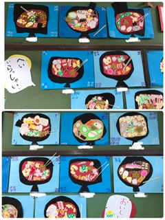 麺は毛糸で、具材のなるとや焼き豚、たまごの絵もおいしそうにに描いて、ラーメンをつくりました。ラーメン鉢の形もお箸の場所もそれぞれに個性的な表現が見られます。何味のラーメンでしょうか?あつあつで湯気さえ感じられますね。どれも美味しそうです。