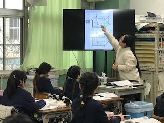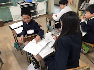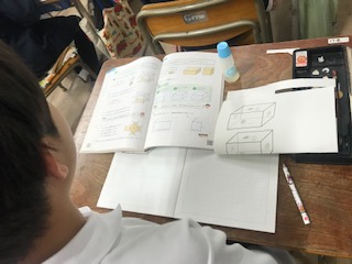 立体の学習です。面や辺の数、頂点など特徴を調べています。友達と考えを共有して学ぶ姿も見られました。
